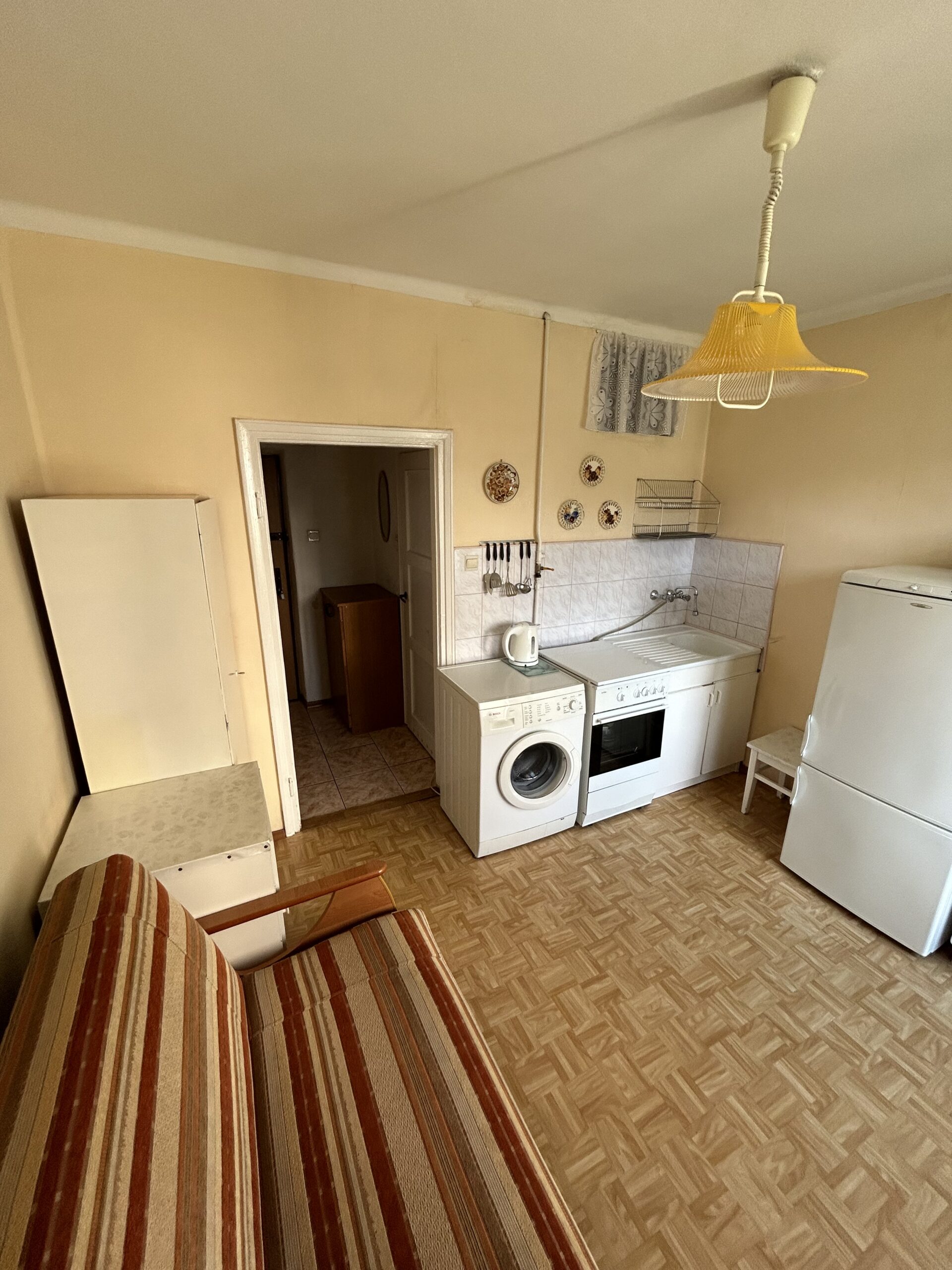 Nieruchomość składa się z jednego przestronnego pokoju, jasnej i ustawnej kuchni, łazienki oraz dużej piwnicy, co sprawia, że jest to bardzo funkcjonalne mieszkanie. Pomimo obecnej potrzeby remontu, nieruchomość posiada duży potencjał, co otwiera możliwości dostosowania jej do własnych preferencji i gustu. W mieszkaniu można od razu zamieszkać i powoli/stopniowo je odnawiać.